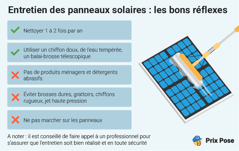 Il faudra donc prévoir un nettoyage une à deux fois par an (généralement au printemps et à l’automne). Il est conseillé de faire appel à une entreprise spécialisée pour cela. Si l’accès aux panneaux est facile et sécurisé (attention à ne pas marcher sur les panneaux solaires), il est possible de s’en occuper soi-même.
