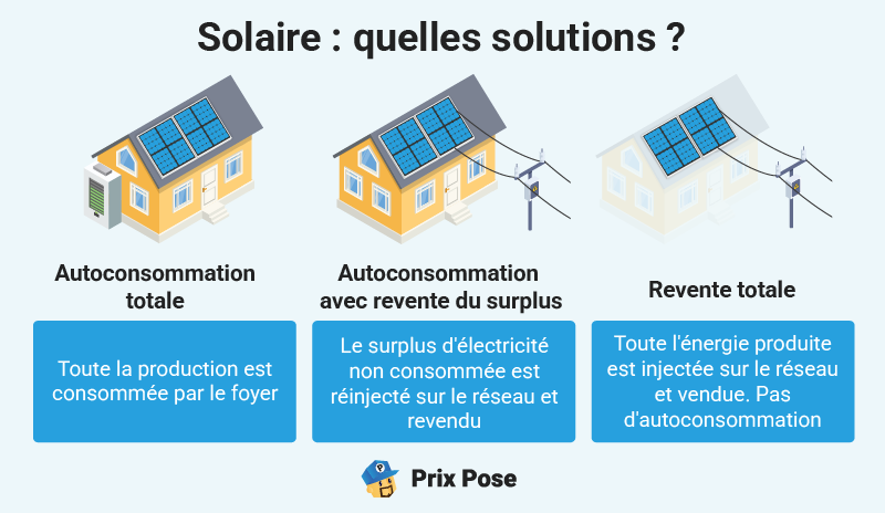 - L’autoconsommation avec revente du surplus : l’électricité produite par les panneaux est consommée directement. L’électricité excédentaire est réinjectée dans le réseau et revendue à un prix fixe.
